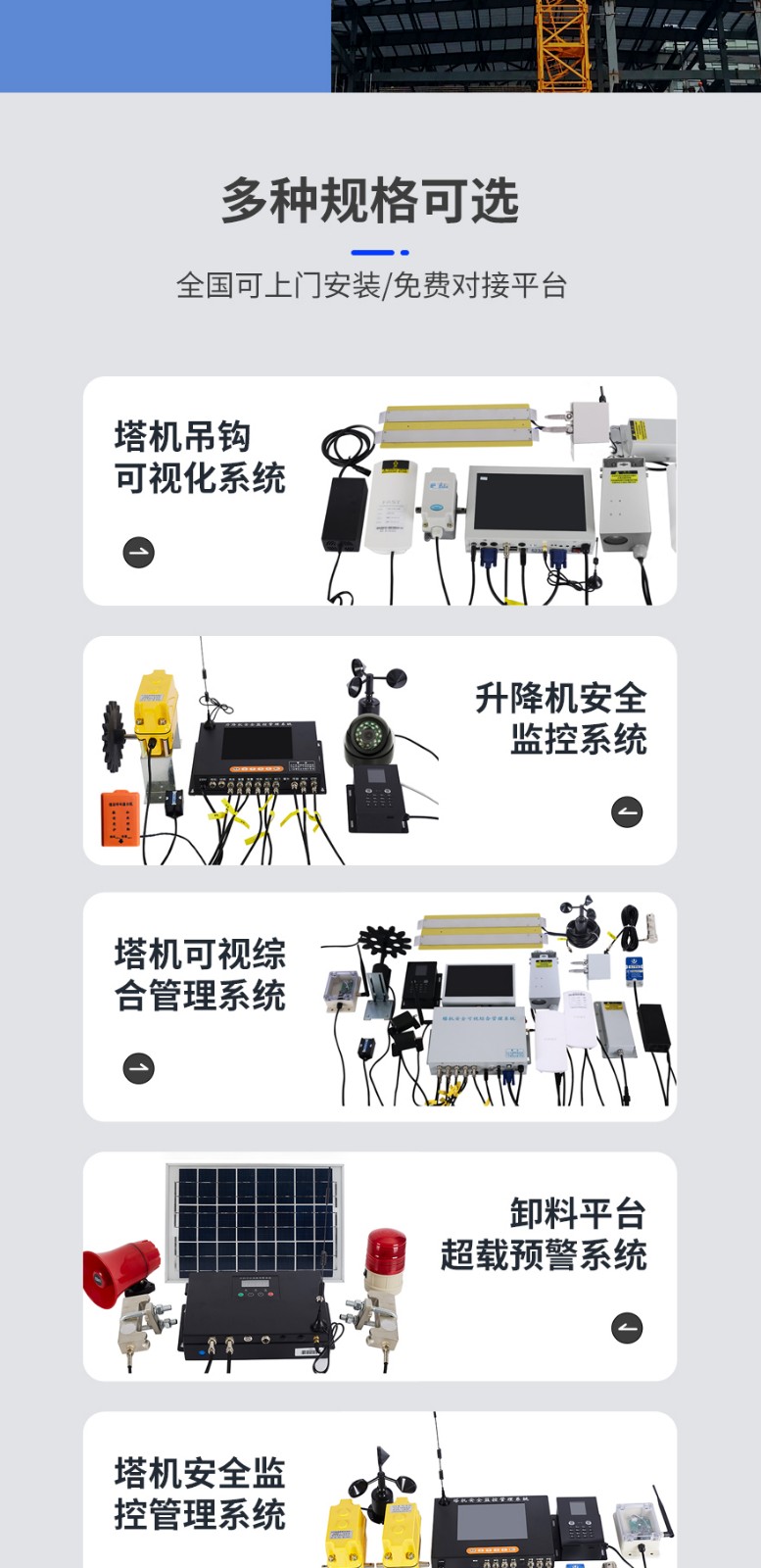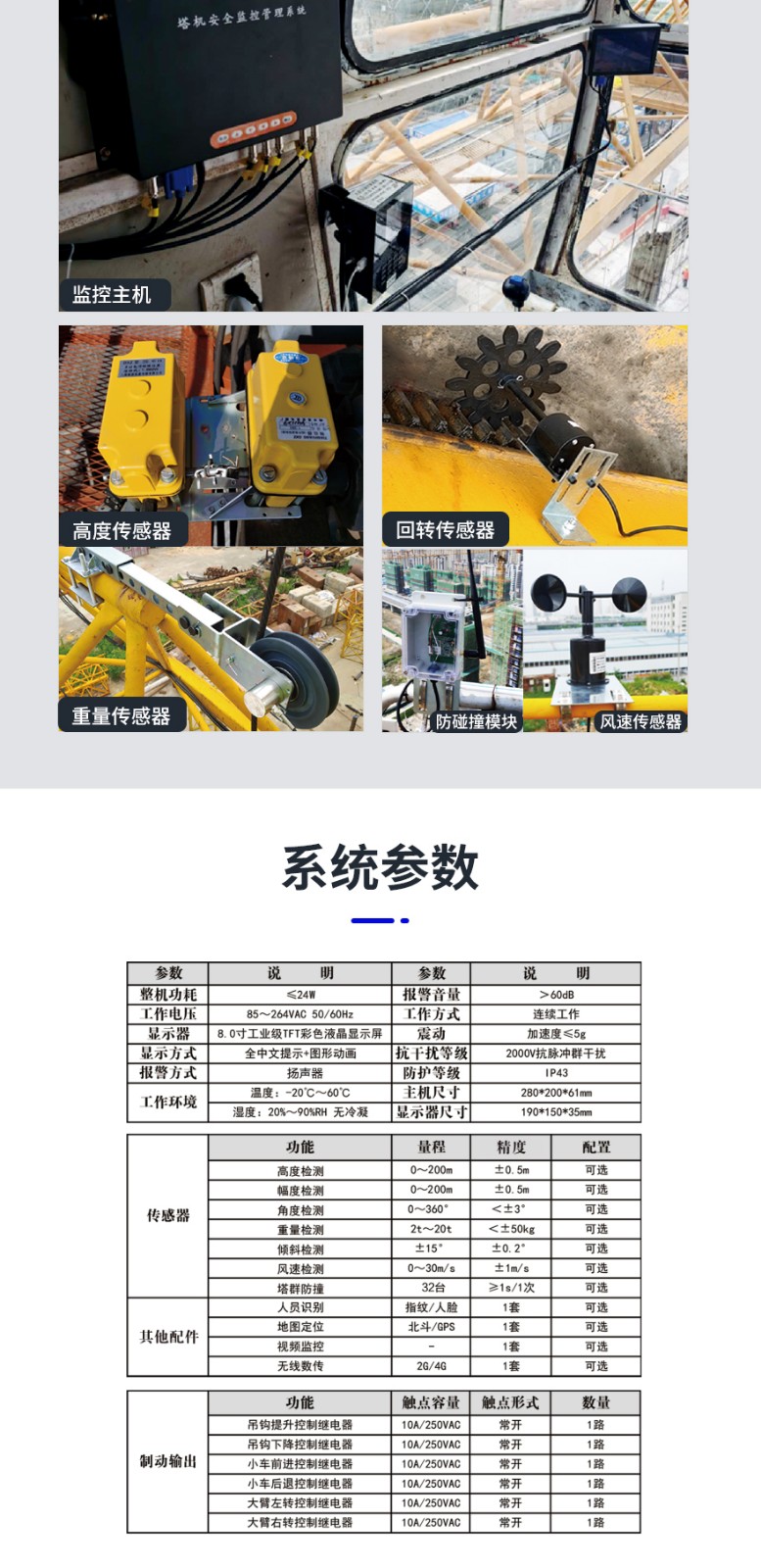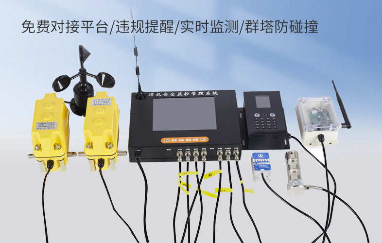 實(shí)時(shí)采集塔機(jī)高度、幅度、回轉(zhuǎn)、重量、傾角、風(fēng)速傳感器數(shù)據(jù),通過處理器計(jì)算后,和用戶設(shè)置的塔機(jī)工作參數(shù)、禁吊區(qū)、禁入?yún)^(qū)相比、分析,能夠?qū)λC(jī)吊鉤沖頂、小車前后超限、區(qū)域碰撞、起吊超重、力矩超限、傾翻等安全事故提前做出精準(zhǔn)判斷,及時(shí)向司機(jī)進(jìn)行報(bào)警提示或自動(dòng)終止司機(jī)當(dāng)前操作,避免安全事故的產(chǎn)生。通過區(qū)域無線聯(lián)網(wǎng)設(shè)備,實(shí)時(shí)和周圍其他關(guān)聯(lián)塔機(jī)交互信息,實(shí)現(xiàn)塔群防撞。通過連接人臉識(shí)別設(shè)備,實(shí)現(xiàn)司機(jī)身份驗(yàn)證,防止非法使用造成安全事故。通過4G無線聯(lián)網(wǎng)設(shè)備,可將數(shù)據(jù)傳輸?shù)竭h(yuǎn)程云平臺(tái),實(shí)現(xiàn)遠(yuǎn)程實(shí)時(shí)監(jiān)控、各種數(shù)據(jù)分析、統(tǒng)計(jì)等功能,實(shí)現(xiàn)工地?cái)?shù)字化建設(shè)。